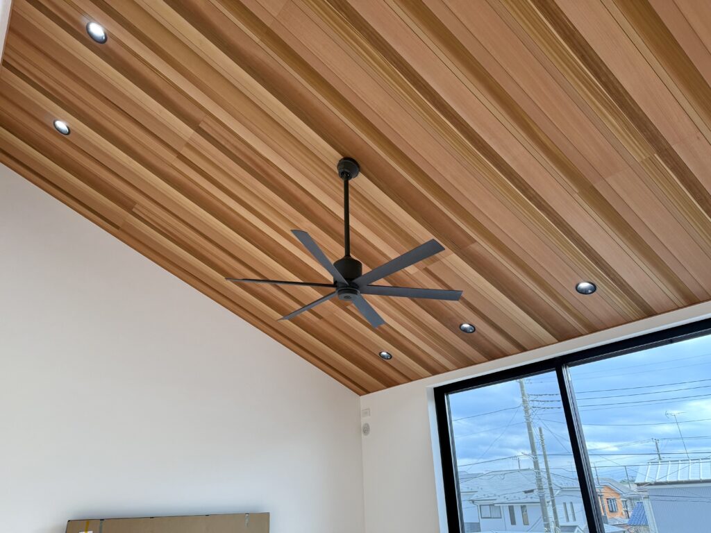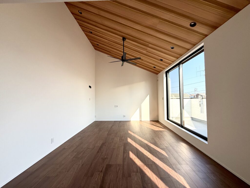 子世帯の23畳LDKは、勾配天井による縦の広がりと大きな窓からの採光で、